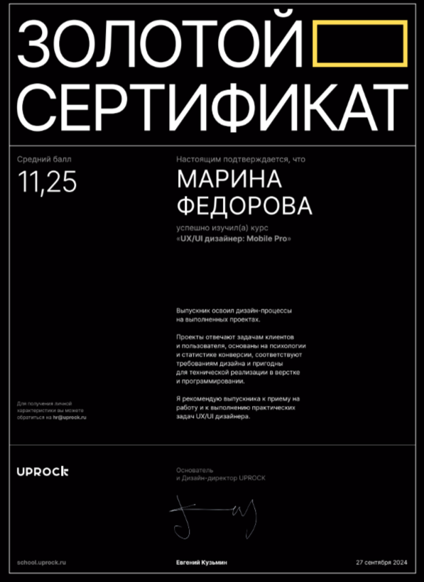 Самостоятельно разработала MVP за 1,5 месяца. Результат был принят руководителем. В настоящее время работаю с визуальной концепцией и готовлю макеты к верстке